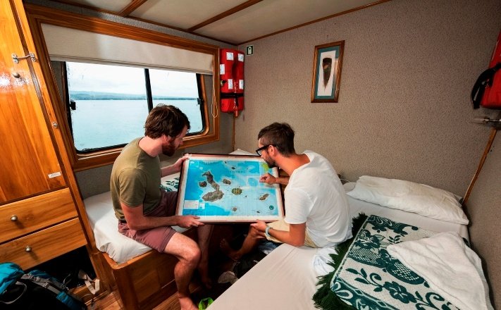 Captain, naturalist bilingual guide, cook, assistant of cook, barman, engineer and two sailors |