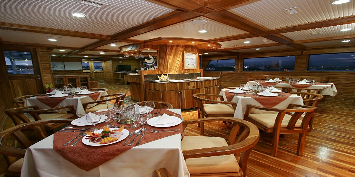 Topside the EcoGalaxy Eco Catamaran caters to just 16 guests in 8 cabins. Four cabins are located on the upper deck, and four are on the main deck, each with AC, private bathrooms with hot and cold water showers, hairdryer, internal telephone and safety deposit box. The upper deck cabins can be interconnected, and all cabins have the choice of either twin or matrimonial bedding. Social areas include a library, indoor lounge with entertainment area, fully stocked bar, dining room and sun deck with loungers.