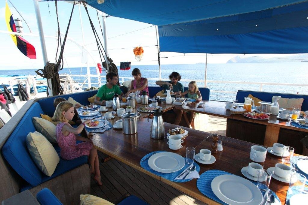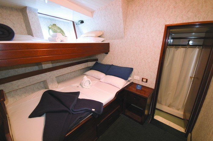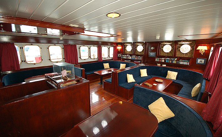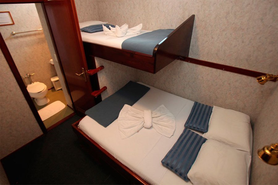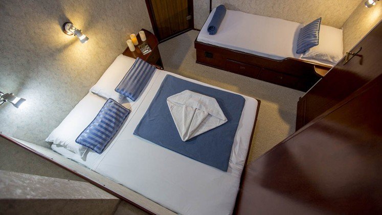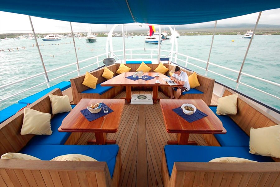 Catering to a maximum of 16 guests, the S/S Mary Anne Galapagos offers 6 double cabins and 6 single cabins. All cabins have private bathrooms with hot water and are designed with one double lower berth and a single upper berth, and two cabins have lower berths. Because the SS Mary Anne was built for 24 guests but caters to a maximum of 16, there is plenty of space to relax on board. Guests can choose the sun deck with open-air seating or the bridge to enjoy the fresh sea air. On the main deck is the dining room, kitchen, lounge with entertainment area and library. Meals can also be served al-fresco to enjoy the stunning Galapagos views and sunsets. Enjoy international and local Ecuadorian cuisine with freshly sourced ingredients.