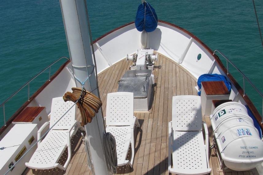M/Y Samba Description: Dutch built with teak decks in 1966 as a luxury private yacht, the Samba is now a perfectly well converted cruise boat specialized for Galapagos Islands vacations. The SAMBA accommodates 14 guests, a perfect number to enjoy the magic of the Islands with privacy and flexibility. Its professional, experienced and friendly crew and naturalist guide are devoted to go the extra mile to make your journey a trip of a life time. The upper deck with an outside dinning area and sun protection is ideal for bird and marine life watching. On the main deck, an outside area with reading, resting and also eating space; and inside, there is a dining salon with library with TV/VCR and Stereo. Here is where briefings and conference-talks are given and planning about next day activities. Foredeck has enough space for sun bathing, dolphin watching or just to relax and observe marine life and the beautiful landscape of the islands. The ample and comfortable space on deck makes this boat ideal for nature and photography cruises.