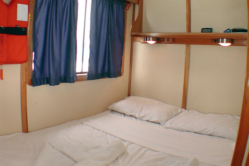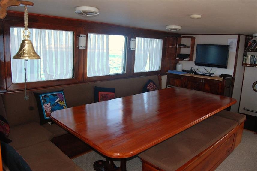 6 air-conditioned double cabins and 1 exterior double bed cabin, all with private bathrooms and hot water. An ample dining-room/salon connects to an outdoor dining facility with large tables, 32" High Definition LCD TV, DVD video equipment, sound-system, mini-library with books and videos and a small bar. |
