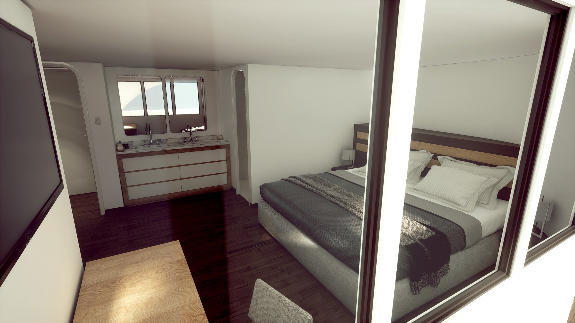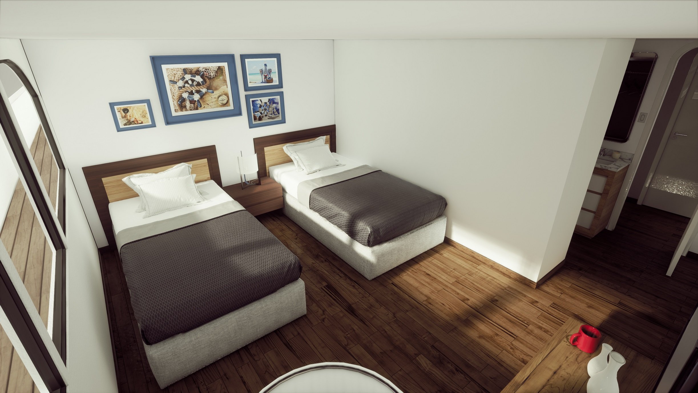 Main Deck: cabins with one king size bed (6.5’ x 6.5’) – Cabins 1 & 2 (210 square feet each cabin) Main Deck: cabins with two single beds (3.15’ x 6.5’)– Cabins 3 to 6 (210 square feet each cabin) Upper Deck: (2)cabins with one king size bed (6.5’ x 6.5’)– Cabins 5 & 6.( 200 square feet each cabin plus 70 square feet balcony) Upper Deck: (4)cabins with single lower beds (6.5’ x 6.5’) – Cabins 7 to 10. (170 square feet each cabin plus 35 square feet balcony) |