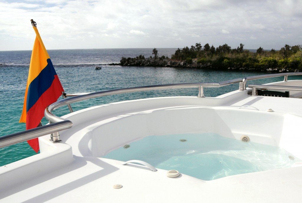 The “Treasure of Galapagos” consists of 1 suite with 2 balconies, 8 double outside cabins with balcony and private bathroom, hot water, air conditioner, and security box. The social areas include a lounge, library with TV and DVD area, dining room, 2 bars, 3 solarium areas, Jacuzzi, and a boutique. Onboard meals include both Ecuadorian and international cuisine prepared by an international gourmet chef. Your expeditions through the islands will be in company of a naturalist guide with a level III license.
