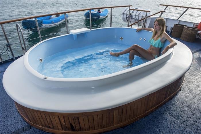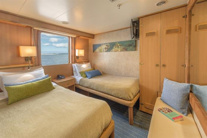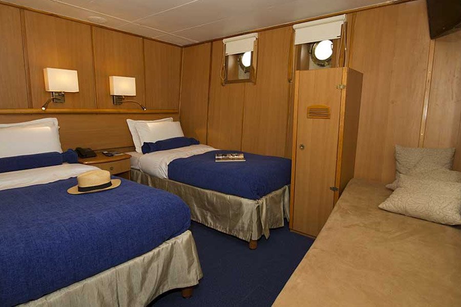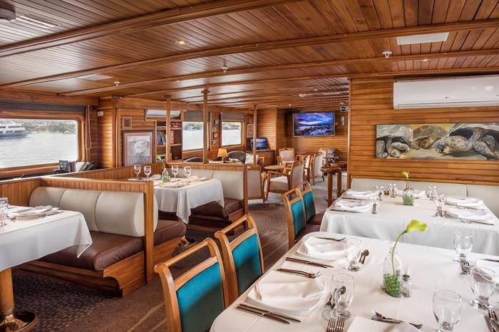 Built in Germany, the Coral 1 is a modern and spacious motor yacht to give a unique Galapagos tour an exclusive touch. The entire interior is made of teak wood and fully carpeted. She has ten cabins located on two decks (2 cabins with single upper and lower berths, 6 cabins with lower double and upper single berths, 2 superior cabins on the upper deck with double beds). Each cabin has its own full private bath and is handsomely decorated with wooden fixtures.