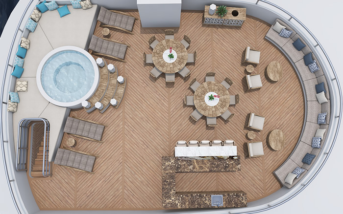 In addition to better stability, the design of the Elite allows for more space for everything on board, including social areas and golden suites. Guests of all ages enjoy the ample, semi-covered sky deck, the al fresco dining area and the cozy bar-salon.