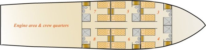Humboldt Explorer offers 8 air conditioned, double cabins with ocean view, TV/ DVD, private bathrooms and showers. The 7 member crew will ensure guest comfort and satisfaction for up to 16 guests. Guests can relax in the air conditioned salon, the covered back deck and sun deck with Jacuzzi.