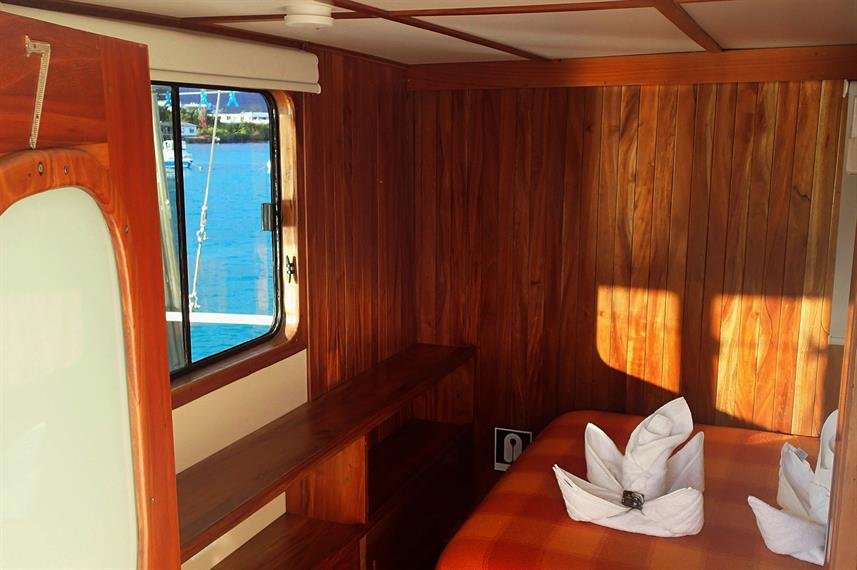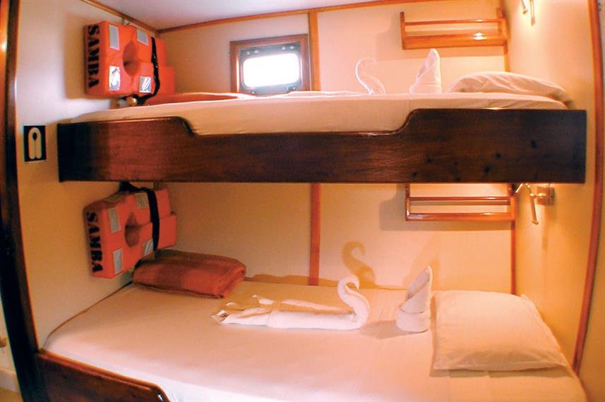 M/Y Samba Description: Dutch built with teak decks in 1966 as a luxury private yacht, the Samba is now a perfectly well converted cruise boat specialized for Galapagos Islands vacations. The SAMBA accommodates 14 guests, a perfect number to enjoy the magic of the Islands with privacy and flexibility. Its professional, experienced and friendly crew and naturalist guide are devoted to go the extra mile to make your journey a trip of a life time. The upper deck with an outside dinning area and sun protection is ideal for bird and marine life watching. On the main deck, an outside area with reading, resting and also eating space; and inside, there is a dining salon with library with TV/VCR and Stereo. Here is where briefings and conference-talks are given and planning about next day activities. Foredeck has enough space for sun bathing, dolphin watching or just to relax and observe marine life and the beautiful landscape of the islands. The ample and comfortable space on deck makes this boat ideal for nature and photography cruises.