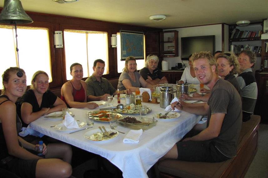 6 air-conditioned double cabins and 1 exterior double bed cabin, all with private bathrooms and hot water. An ample dining-room/salon connects to an outdoor dining facility with large tables, 32" High Definition LCD TV, DVD video equipment, sound-system, mini-library with books and videos and a small bar. |
